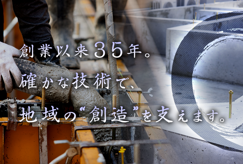 弊社は昭和61年の創業から35年以上にわたり、地域の発展・創造を陰ながらサポートする企業として歴史を重ねてきました。おかげさまで多くのご依頼主さまとご縁をいただき、今後もご期待に沿えるよう一路邁進いたす所存です。引き続き、土木工事を通して地域に貢献してまいりますので、弊社に変わらぬご高配を賜りますようお願い申し上げます。